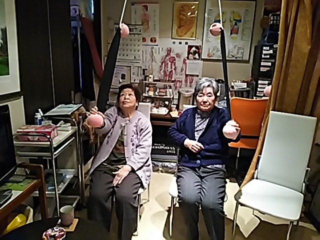 利用者さんの肩の所に握りやすいようにボールが来るように結んであります。