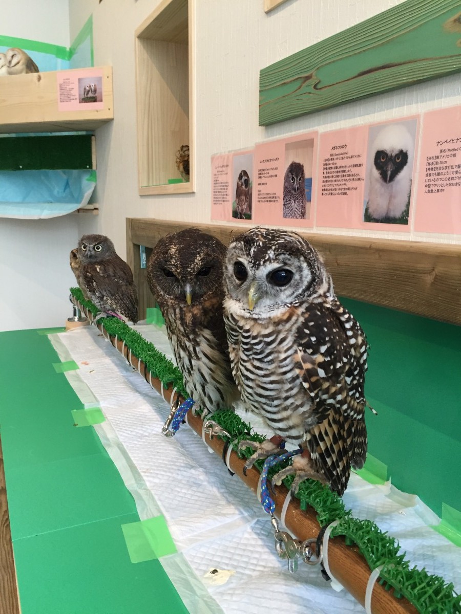 店内には手乗りサイズから、ハリーポッターの白フクロウのような大きなフクロウまで全部で20羽近くのふくろうがずらり~