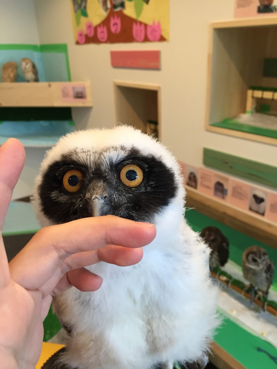 もう少し大きい子はこのように手袋を貸してもらえます。人に慣れたフクロウはとてもおとなしいです![]()