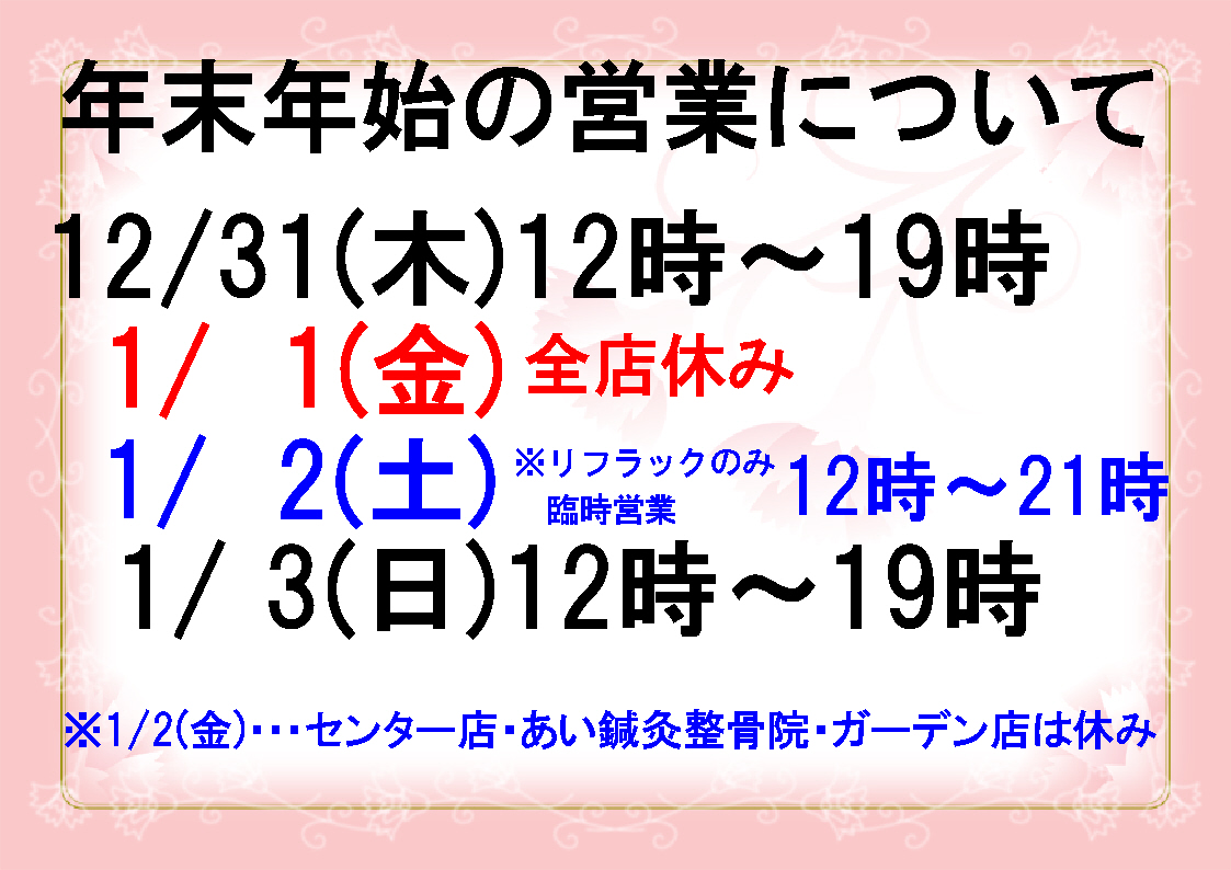 お忙しくて、なかなかお時間が取れない方もいらっしゃると思いますが、リフレッシュグループの年末年始の営業時間は下記のとおりとなっておりますので、ぜひお時間を見つけてご来店くださいね