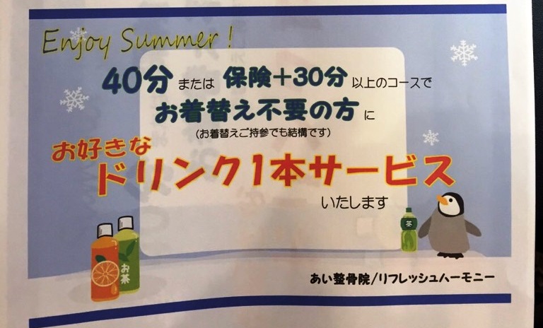 ドリンク無料サービス実施中!★あい整骨院&リフレッシュハーモニー
