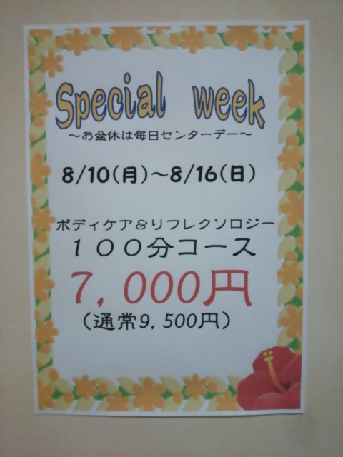 毎月15日センター店では『センターデー』と称して100分コース(ボディケア&リフレクソロジー)を7000円(通常9500円)でご案内させて頂いております。かなりお得なコースということで、お客様に大変ご好評頂いてるキャンペーンです