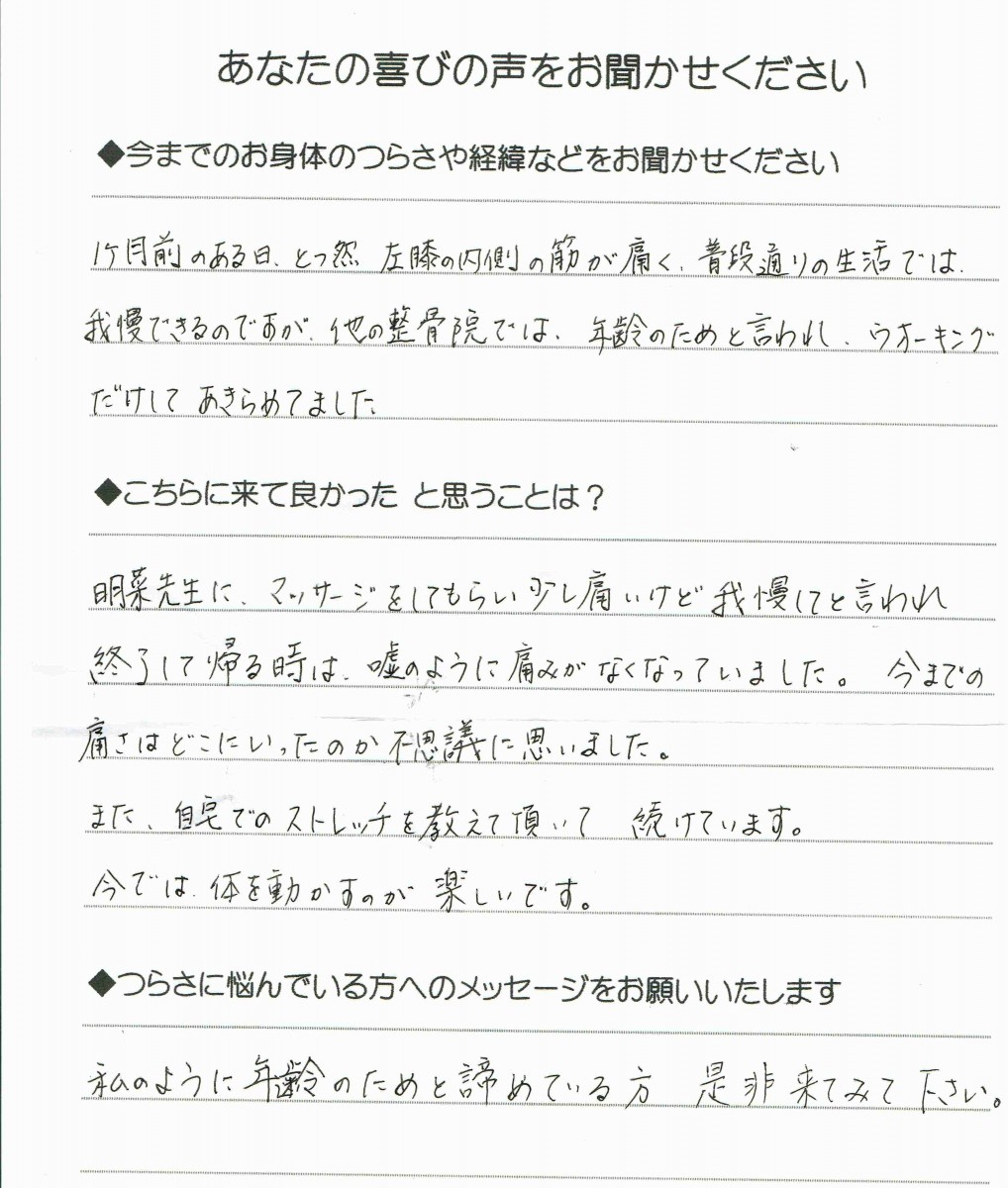 1ケ月前のある日、とつ然、左膝の内側の筋が痛く、普段通りの生活では我慢できるのですが、他の整骨院では年齢のためと言われ、ウォーキングだけしてあきらめていました。