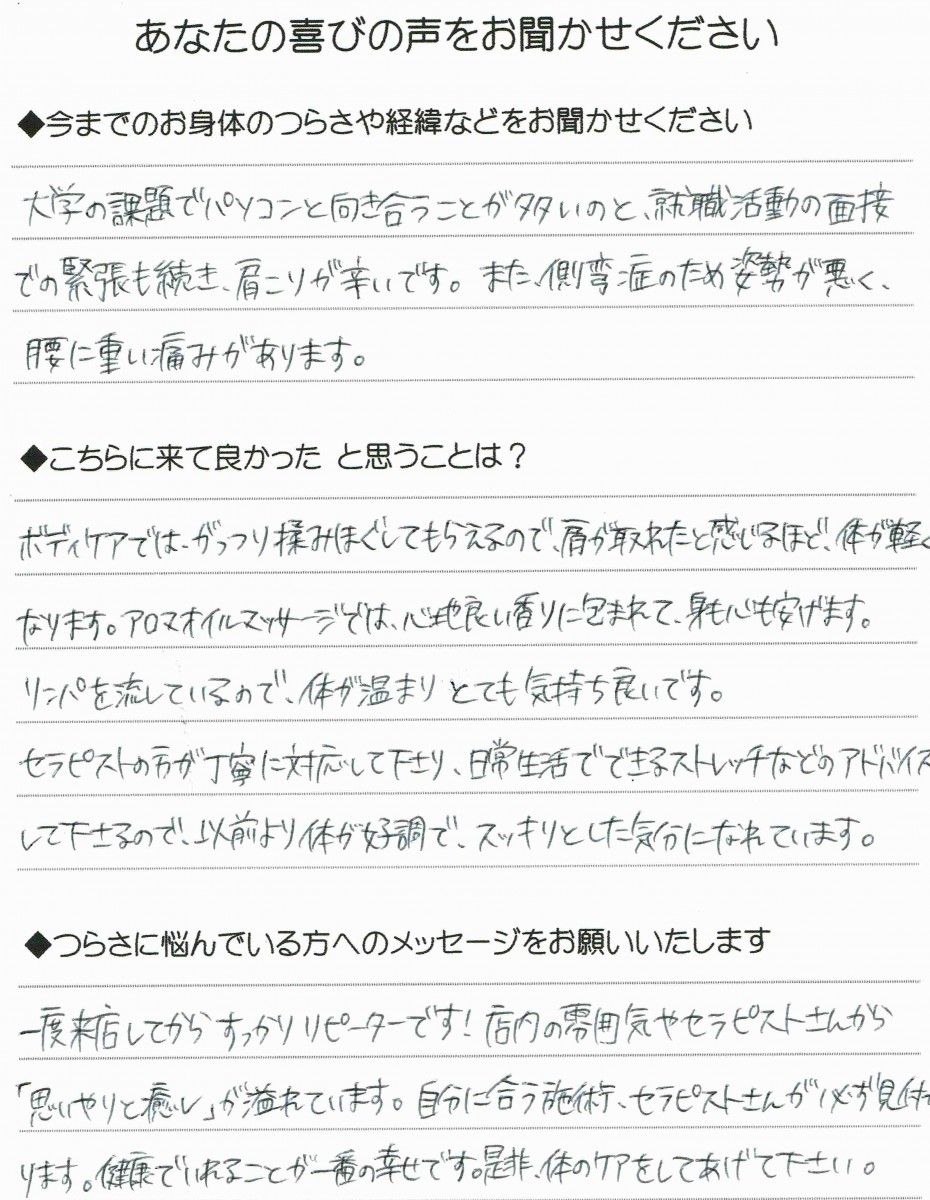 大学の課題でパソコンと向き合うことが多いのと、就職活動の面接での緊張も続き、肩こりが辛いです。まだ側弯症のため姿勢が悪く、腰に重い痛みがあります。