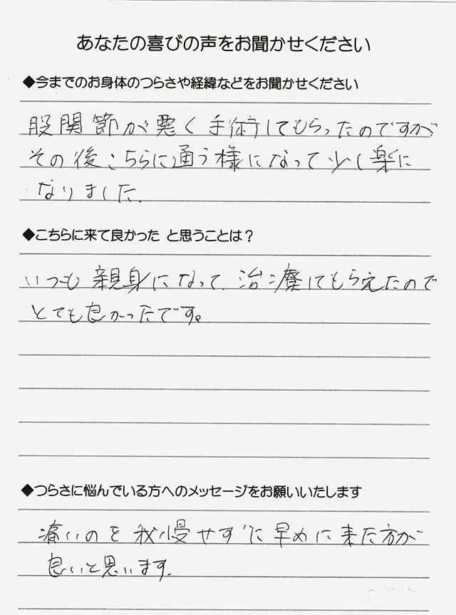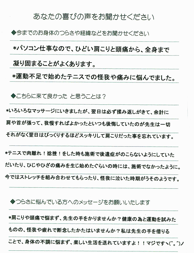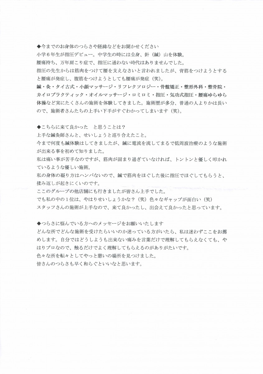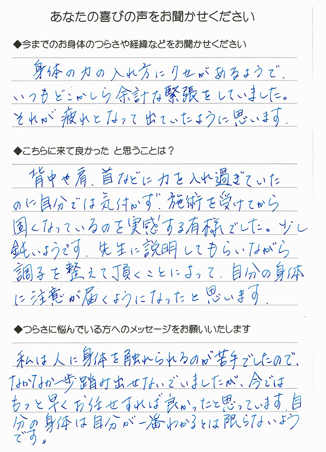 - 私は人に身体を触れられるのが苦手でしたので、なかなか一歩踏み出せないでいましたが、今ではもっと早くお任せすれば良かったと思っています。自分の身体は自分が一番わかるとは限らないようです。