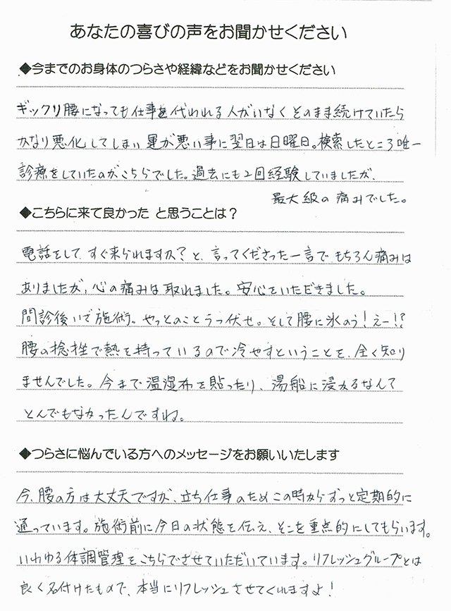 今、腰の方は大丈夫ですが、立ち仕事のためこの時からずっと定期的に通っています。施術前に今日の状態を伝え、そこを重点的にしてもらいます。いわゆる体調管理をこちらでさせていただいています。リフレッシュグループとは良く名付けたもので、本当にリフレッシュさせてくれますよ!