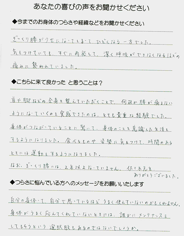 ぎっくり腰がクセになってしまって、ひどくなる一方でした。気を付けていてもすぐに再発して、深く呼吸ができなくなるほどの痛みに襲われていました。