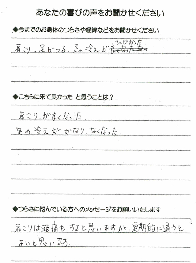 肩こり、足がつる、足の冷えがひどかった。