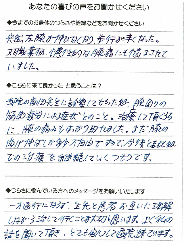 当院の前田先生に診察してもらったところ、膝周りの筋肉疲労による症状とのこと。治療して頂くうちに膝の痛みもすっかり取れました。まだ膝の曲げ伸ばしが多少不自由ですので今後ともここでの治療を継続していくつもりです。