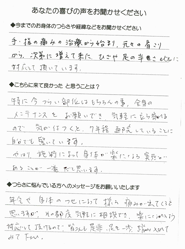 手、指の痛みの治療から始まり、元々の肩こりから次第に増えてきた、ひざや足の辛さetcに対応して頂いています。