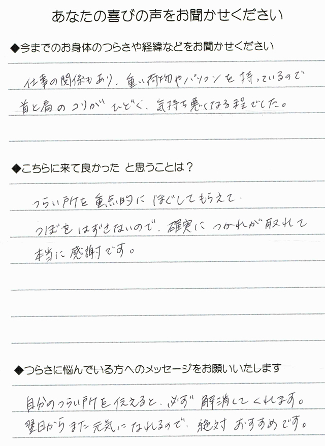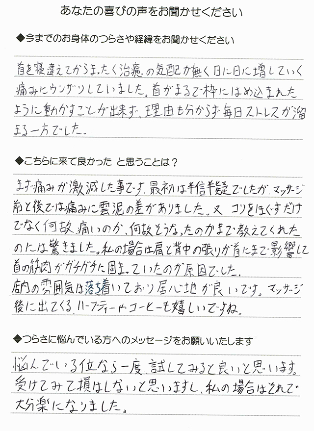 まず痛みが激減した事です。最初は半信半疑でしたが、マッサージ前と後では痛みに雲泥の差がありました。又、コリをほぐすだけでなく、何故痛いのか、何故そうなったのか、まで教えてくれたのには驚きました。私の場合は肩と背中の張りが首にまで影響して首の筋肉がガチガチに固まっていたのが原因でした。
