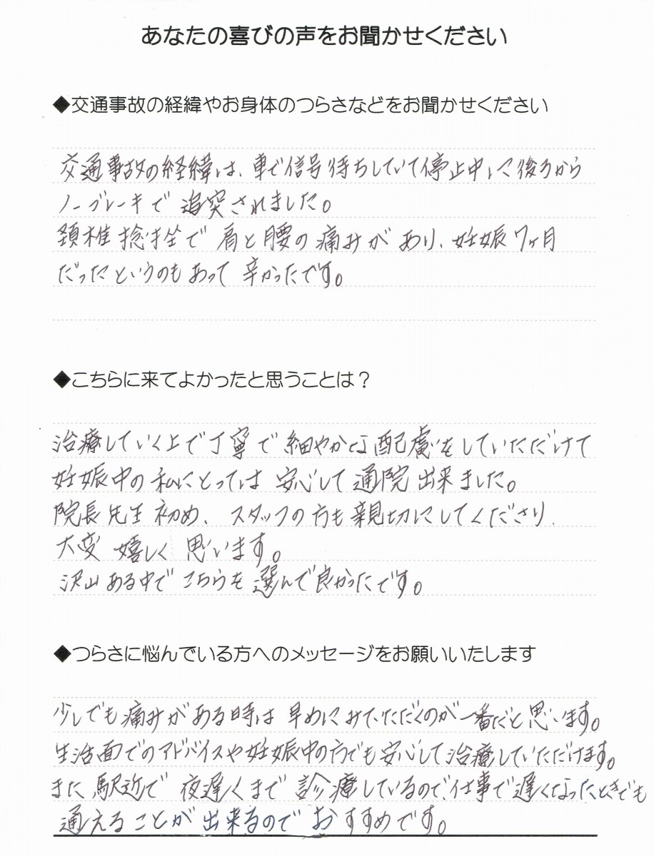 頸椎捻挫で肩と腰の痛みがあり、妊娠7ケ月だったというのもあって辛かったです。